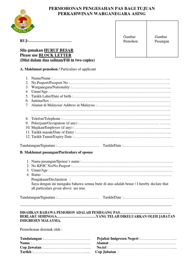 Borang Pengesahan Pas Bagi Tujuan Perkahwinan Dengan Warganegara Asing Pdf