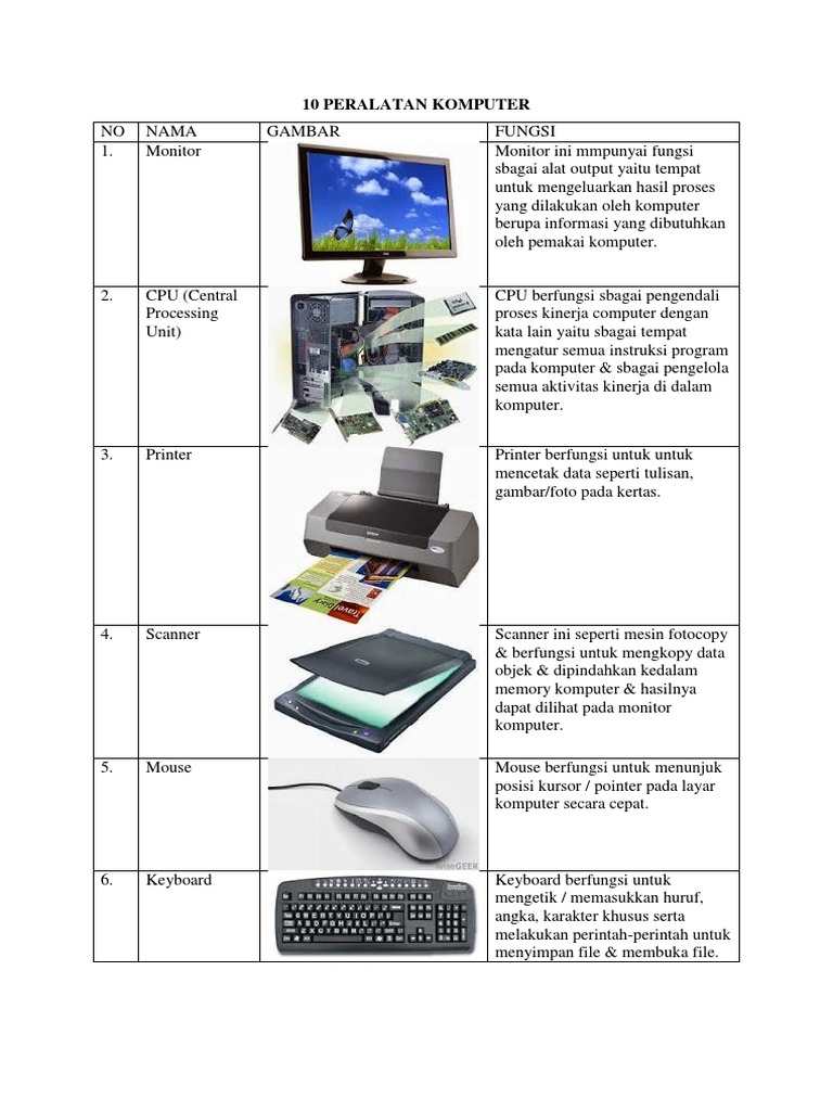 Berikut adalah beberapa jenis perkakasan komputer yang termasuk peranti output dan juga fungsinya masing-masing. Jumlah - penunjuk utama prestasi RAM. JADUAL FUNGSI PERKAKASAN DAN PERISIAN KOMPUTER Komponen asas fizikal komputer terdiri daripada peranti input unit sistem pemprosesan storan dan output.